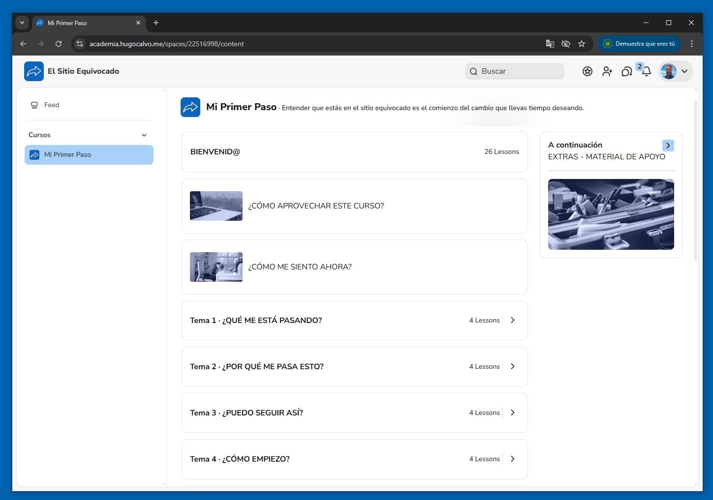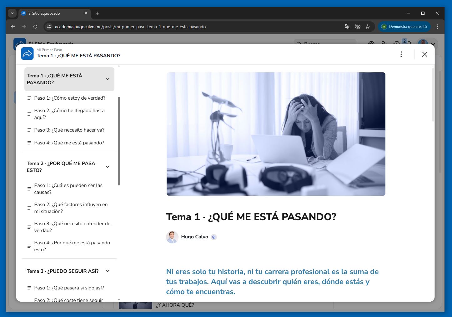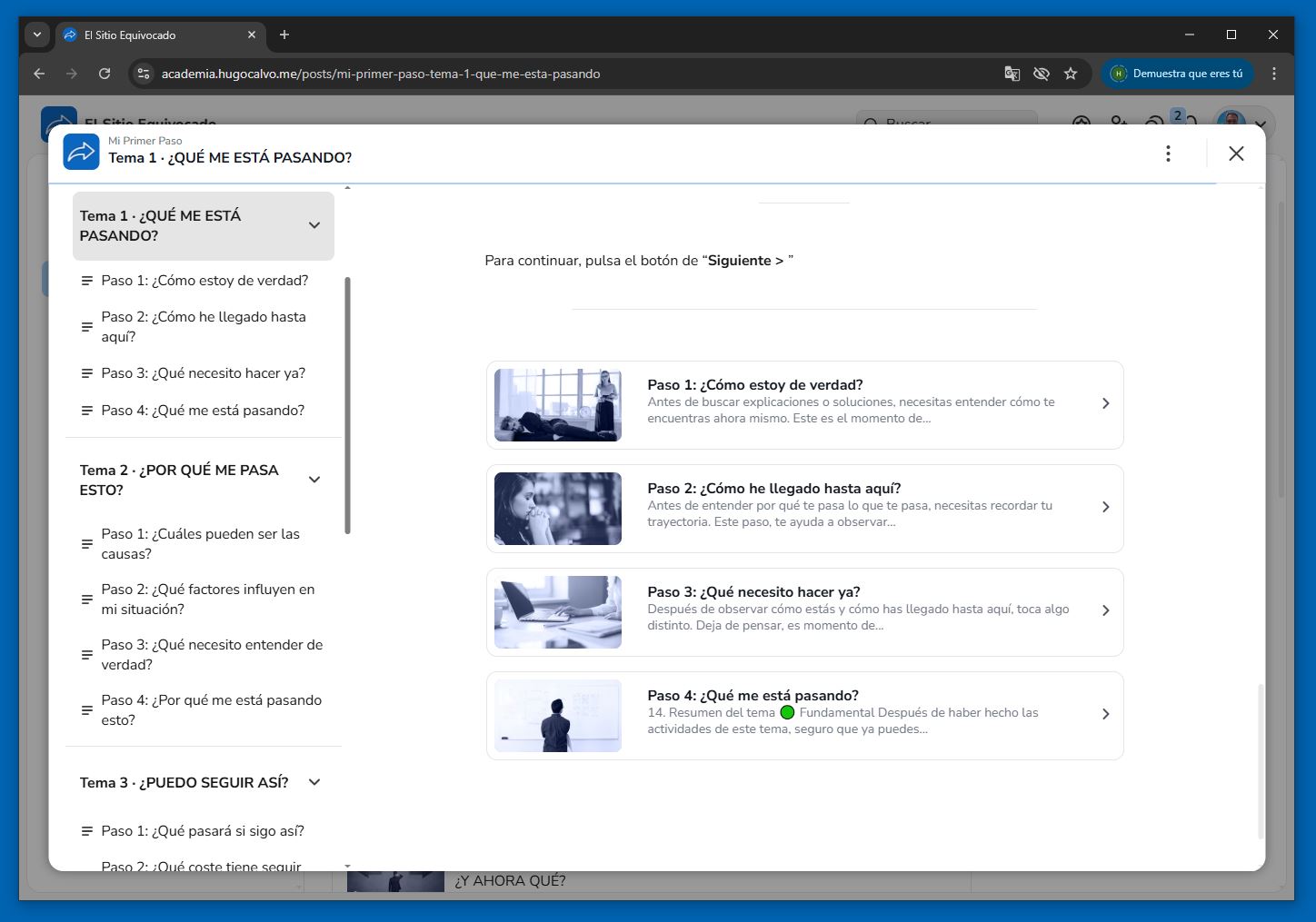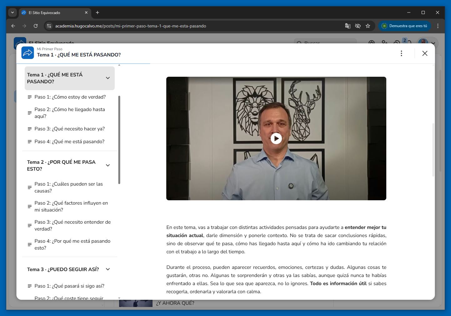 Empieza con un minicurso práctico y directo. En pocas horas tendrás claridad sobre qué te está pasando, por qué te sientes así y qué necesitas empezar a cambiar. Es un espacio de reflexión estructurada para ordenar tu situación antes de tomar decisiones más grandes.